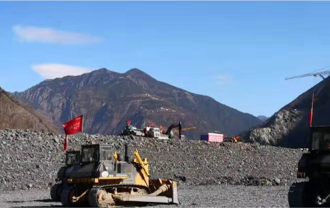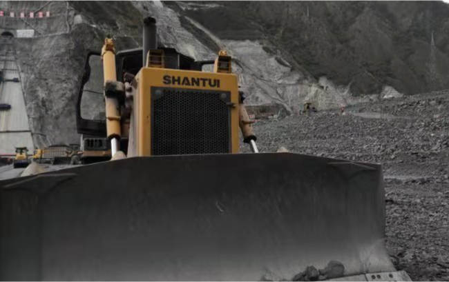 SD32推土机举行西南地区水电站坝体建设,,,推土机将土、石子等松散物料举行推移群集,,,压路机压平,,,浇注混凝土形成坝体。。。。。。。