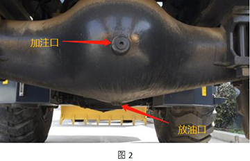 6、 事情完成后,,,将车辆停平稳,,,拉紧手制动,,,将前后桥的放油塞(图2)堵拆下,,,放出桥包里的油液,,,用备用桶网络并妥善处置惩罚。。。。将塞堵整理清洁。。。。